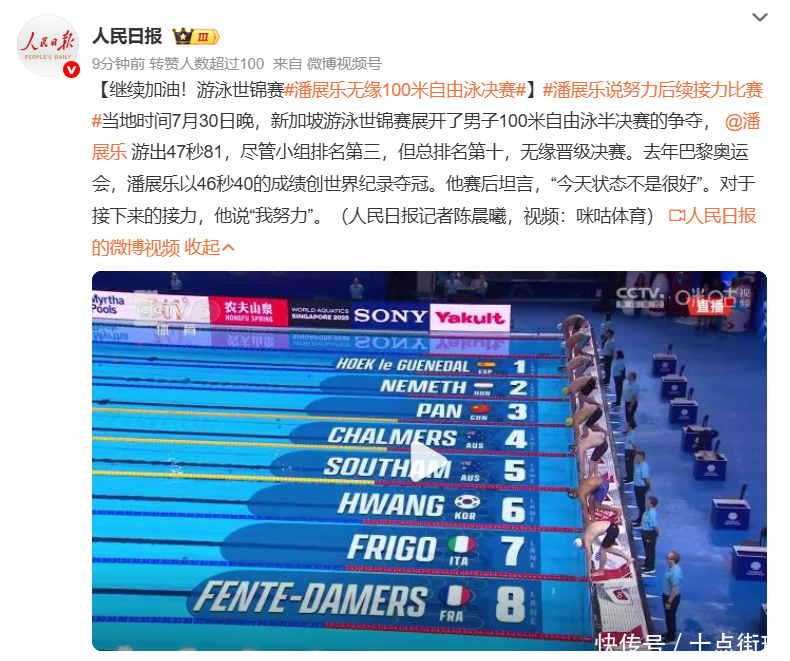 新加坡体育城水上畅通中心泳池的灯光下天天有喜酷娱网,潘展乐触壁后猛然昂首,电子屏上跳出一个明慧的数字:47秒81,这个在绝大大宗选手眼中号称优秀的收获,此刻却将他挡辞世锦赛男人100米解放泳决赛门外,总排名第十,距离晋级线仅差两个排行,只是一年前,巴黎奥运会的合并神色中,他曾以46秒40的世界记载创造“断崖式起首”遗迹,让世界咋舌,从巅峰到低谷,竞技体育的粗暴在这一刻显露无遗